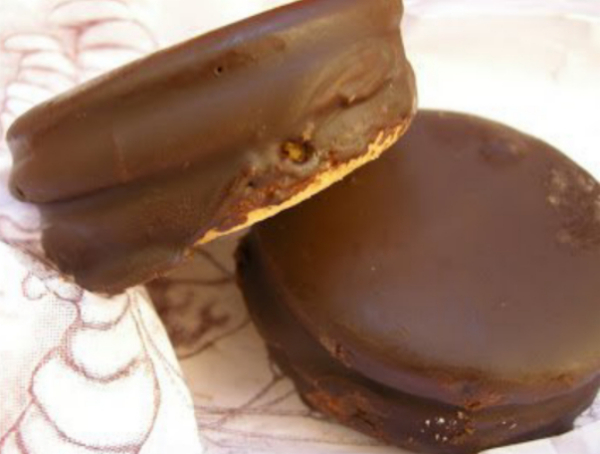 Verter el chocolate sobre los alfajores por un lado y dejarlos reposar ligeramente. Con cuidado, darles la vuelta y volver a verter chocolate