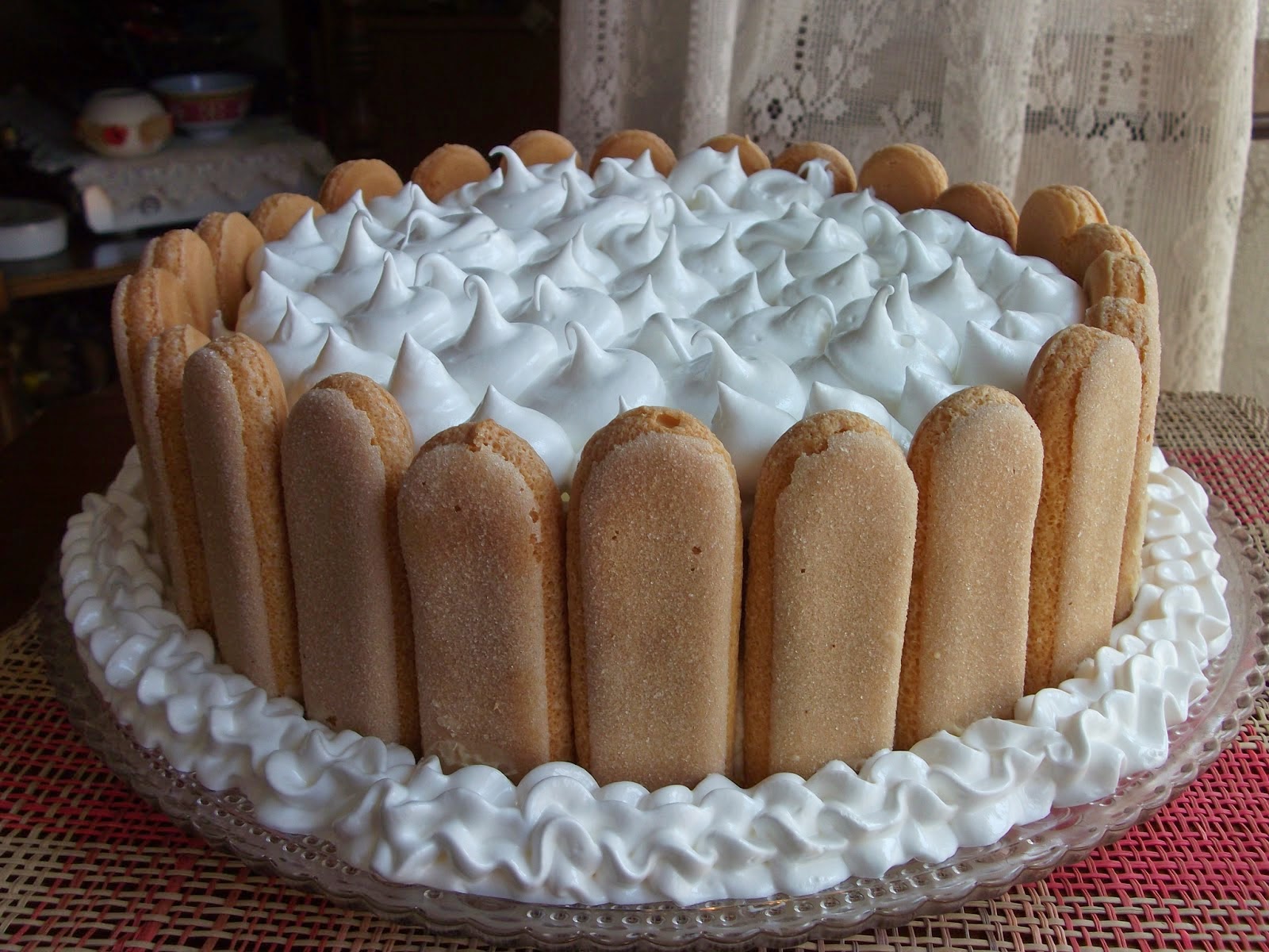Acomodar las galletas de champagne (humedecida en un poco de almíbar) en un molde redondo, la base y laterales.
