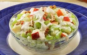 Pelar las manzanas y cortar en cubitos y colocar en una ensaladera, limpiar las ramas de apio cortar en rodajas finas y mezclar con la anterior preparación, mezclar con la mayonesa crema y nueces.