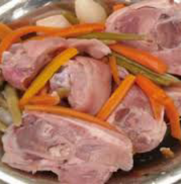 Aparte cocinar las verduras cortadas en bastones en agua y sal por 10 minutos, escurrir y luego agregar las patitas a la verdura y el vinagre y la pimienta blanca dejar de dar otro hervor y reservar.