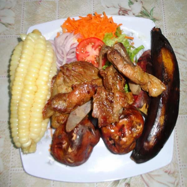 En una fuente de hornear enmantecada colocar el lechoncito, la parte del cuero hacia abajo, llevar a horno precalentado a temperatura moderada y dejar coser la carne, mientras tanto colocar en latas de horno las papas y los postres bien lavados, pasar por encima de estos un poco de aceite, sobre cada uno y llevar al horno hasta que se horneé bien, lavar los choclos y cocinarlos en agua hasta que estén tiernos. Cuando la carne este cocida dar la vuelta para dorarla, una vez que este crocante retirar del horno.