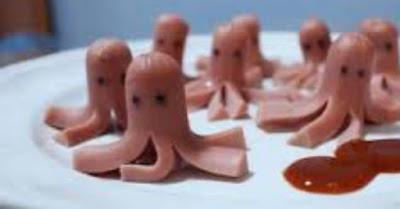 Primeramente corta por la mitad las salchichas ,toma una mitad y da dos cortes hasta la mitad gira la salchicha y da dos cortes y repite el mismo procedimiento con las demas salchichas y colocalas dentro de una cacerola en agua hirviendo por el espacio de 3 a 5 minutos y luego escurre el agua, deja enfriar un poco y coloca  en una bandeja lechuga previamente lavada y picada, extiende en una bandeja, y coloca las salchichas en forma vertical extendiendo los cortes en forma de pulpo y  decora con mayonesa los ojos y la boca con ketchup  y un mondadiente introducido en la parte de arriba de la cabesita de cada pulpo .