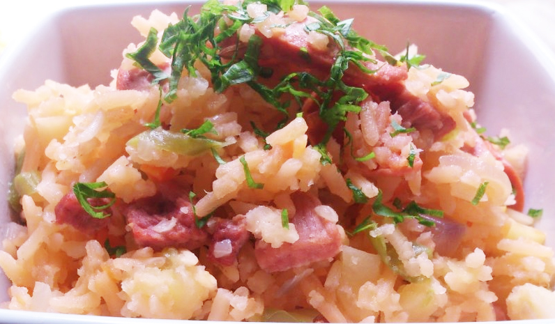 Primeramente cortas en cubos las papas y sancocharlas en agua y sal por unos minutos, pelar las verduras y picarlas en cubos pequeños y sofreirlas en un sarten junto alas salchichas previamente picadas añadiendo con un poco de aceite, cocinar el arroz y los 5 minutos lavar en abundante agua una y otra vez cuando ya este bien lavado unir las tres preparaciones de papas,verduras y salchichas sofreidas y el arroz lavado y dejar cocinar por completo añadiendo un poco de agua y corregir la sal y dejar hasta que arroz este blando.